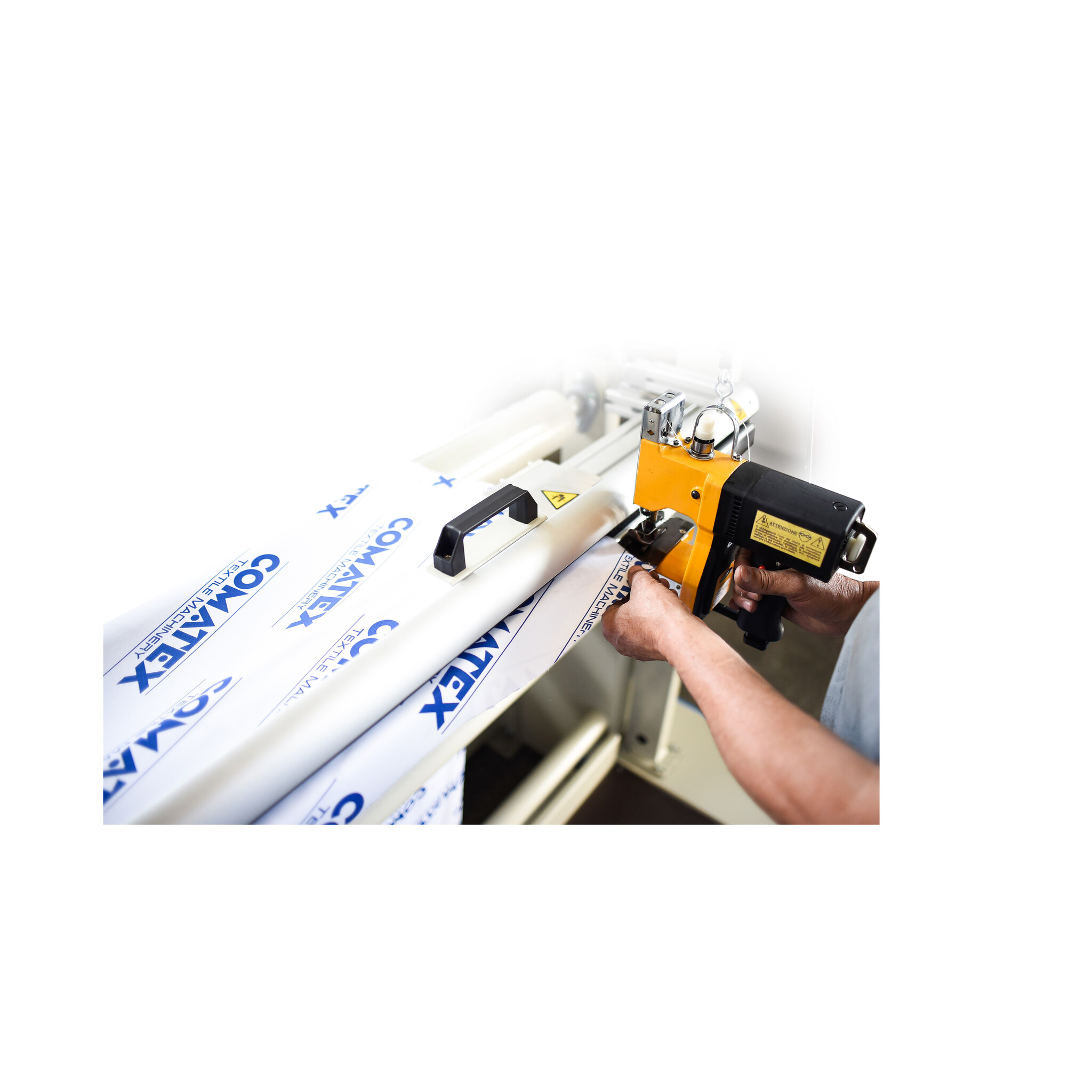 Starke tragbare Nähmaschine mit 220 Volt oder 36 V Akku zum Zusammennähen von Stoffrollen.