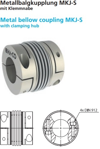 Metallbalgkupplung MKJ-S hat einen Balg mit Klemmnabe mit einem Wellendurchmesser bis 60 mm geeignet für Temperaturen bis 150 Grad Celsius