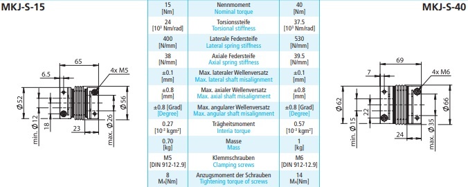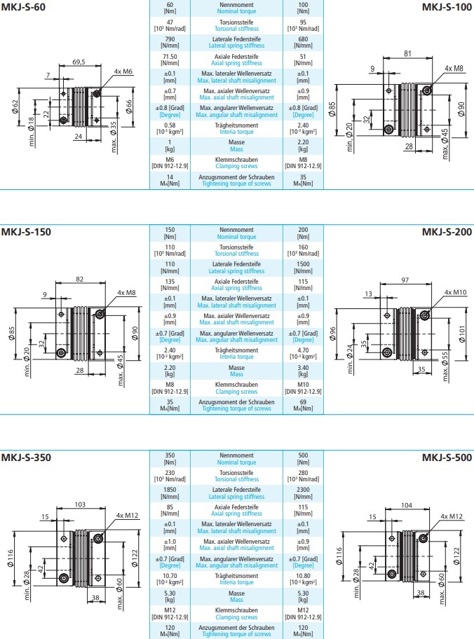 Metallbalgkupplung MKJ-S ist der große Bruder der Baureihe MKJ. Die Klemmnaben sind mit zwei Schrauben ausgestattet. Die Naben sind in Stahl gefertigt und mit dem Metallbalg verschweisst. Die ideale Lösung für eine exakte und winkelgetreue Verbindung von zwei Wellen. Es können Axial-, Lateral- und Winkelversatz zwischen zwei Wellenenden ausgeglichen werden.