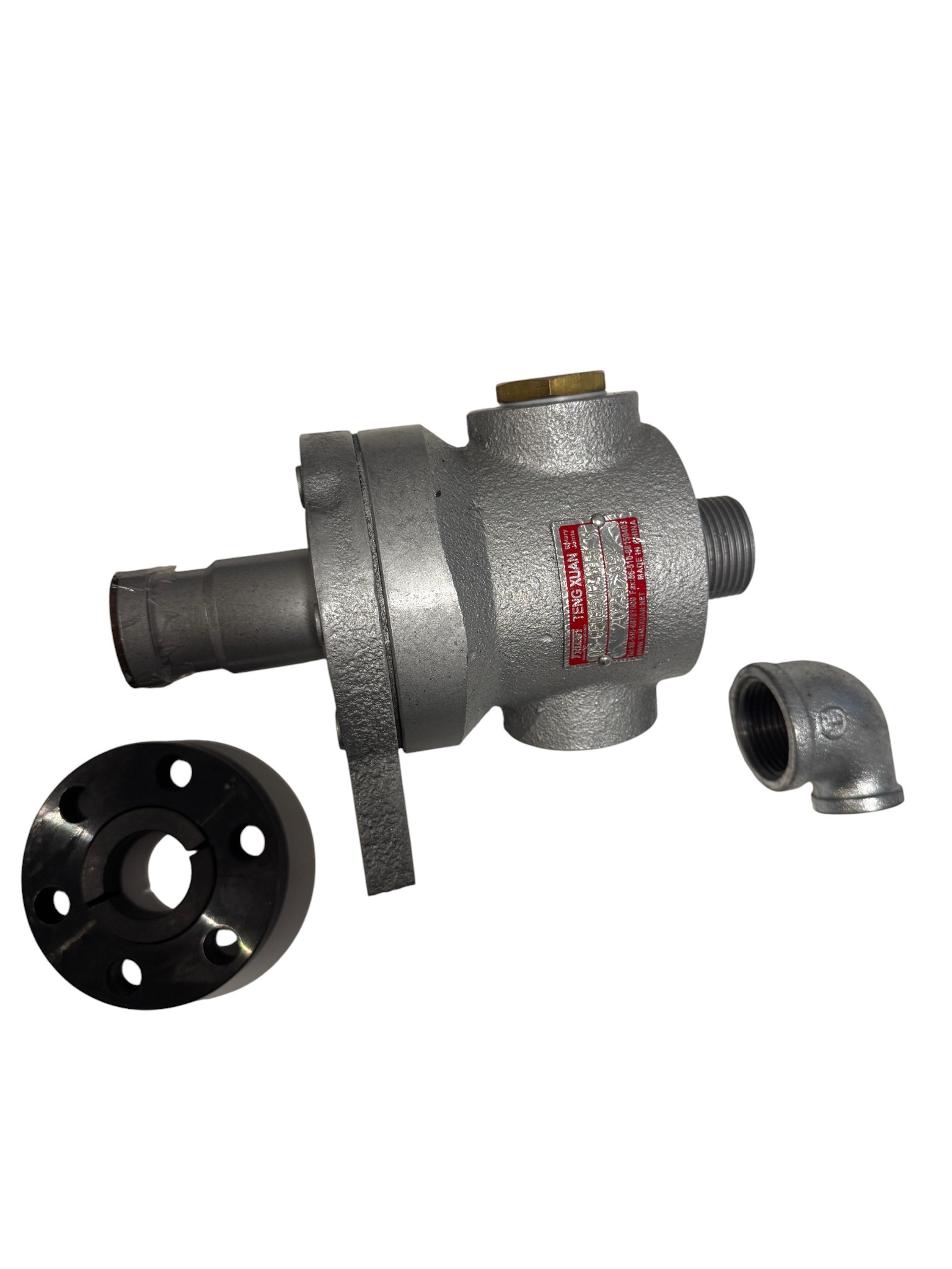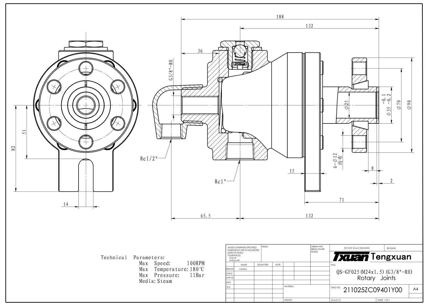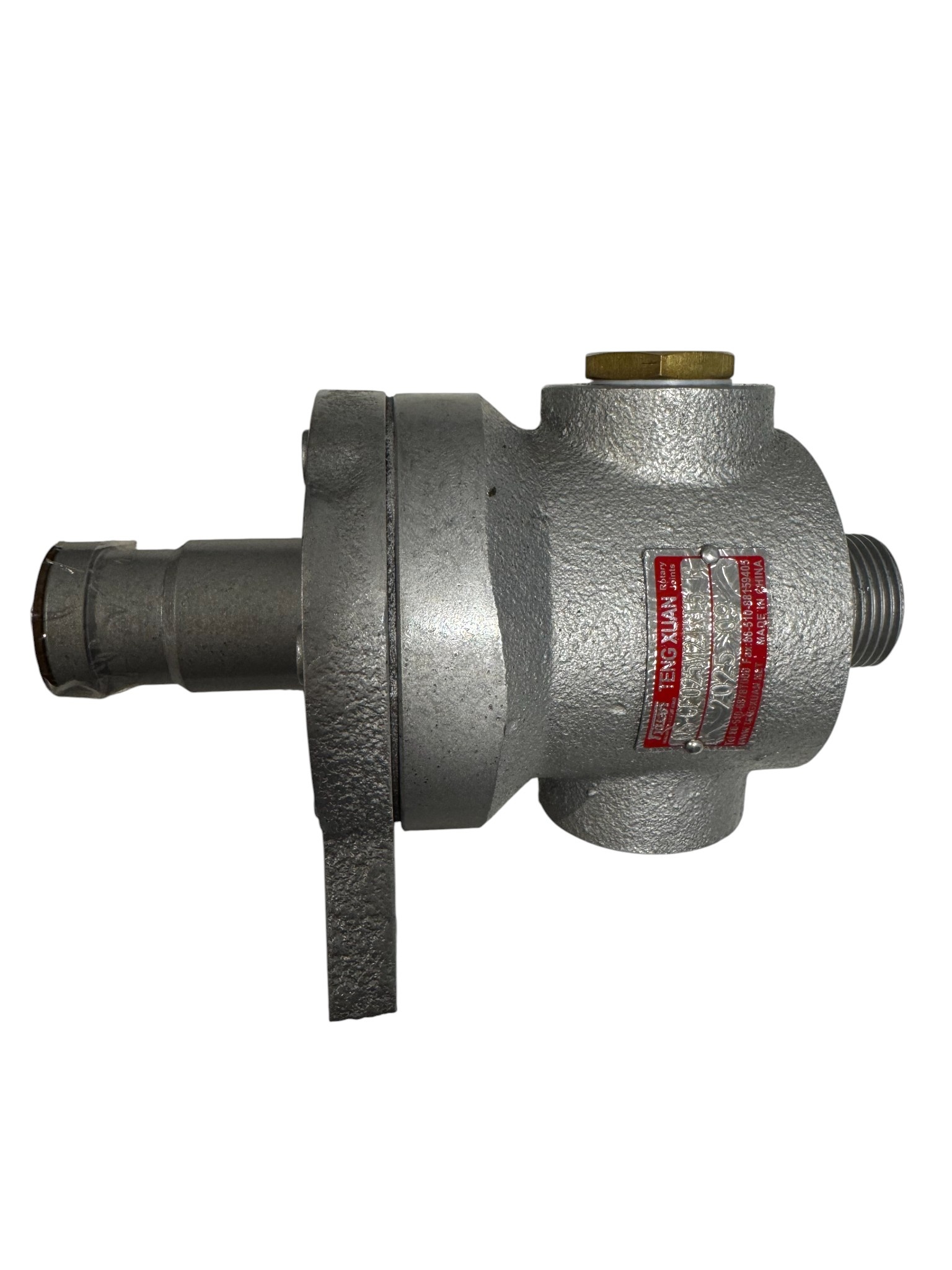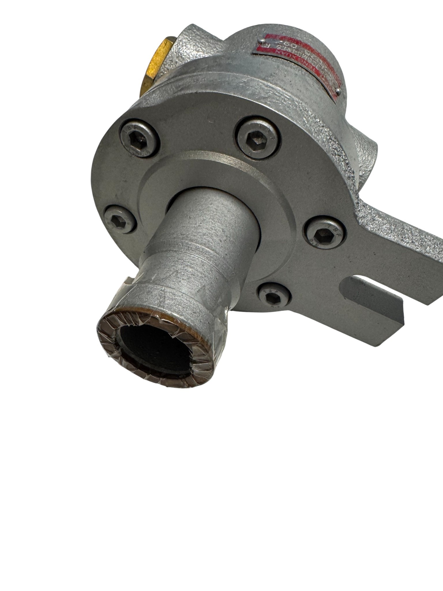 Die QS-GF-Drehdurchführung verfügt über einen Flanschanschluss am Rotor. Der Auslass ist mit einem Gewinde versehen. Die QS-GF-Drehdurchführung ist zusätzlich mit einem Vakuumventil ausgestattet.