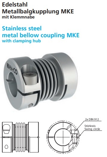 Volledig in roestvrij staal en daardoor ideaal geschikt voor machines in de medische en voedingsmiddelenindustrie: de MKE roestvrijstalen koppeling. De roestvrijstalen klemnaven zijn aan de compacte metalen balg gelast. Door hun compacte afmetingen hebben de koppelingen een laag massatraagheidsmoment.